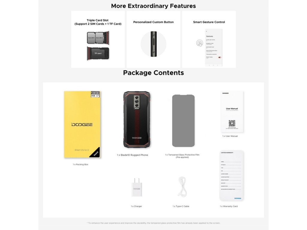 Doogee Blade 10 je cenově dostupný odolný telefon s extra tenkým tělem o tloušťce pouhých 10,7 mm. Blade 10 je model nabízející výborný poměr cena výkon. Je vybaven například solidní baterií o kapacitě 6 150 mAh! Až 24 GB RAM a základní vnitřní úložiště s kapacitou 128 GB vnitřní úložiště zajišťuje dostatečnou kapacitu pro plynulý chod. Vnitřní úložiště je možné rozšířit až o další 1 TB pomocí paměťové micro SD karty. Nechybí také s certifikace IP68 / IP69K a MIL-STD-810H.