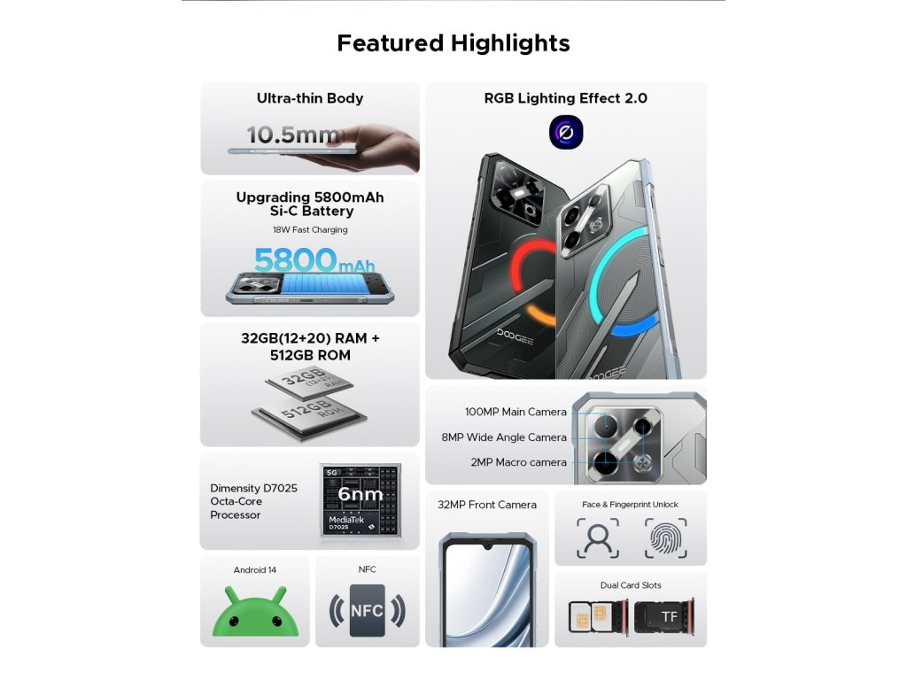 12GB + 20GB RAM | 512GB ROM | Dimensity 7025 | 6.72 palce | 5800 mAh baterie | IP68 | MIL-STD-810H | čtečka otisku prstů | NFC | české LTE | 100MPx + 32MPx | Android 14 | reverse charging | světelné LED efekty na zadní straně | dual sim