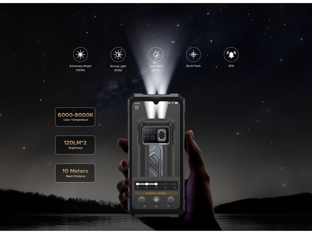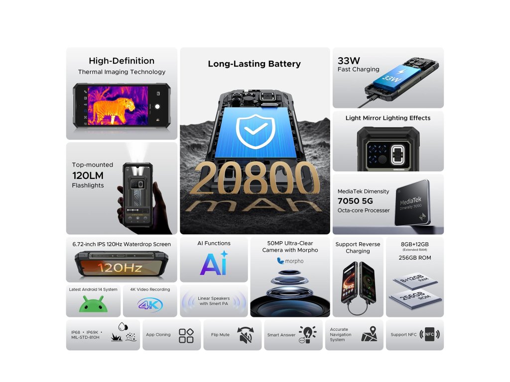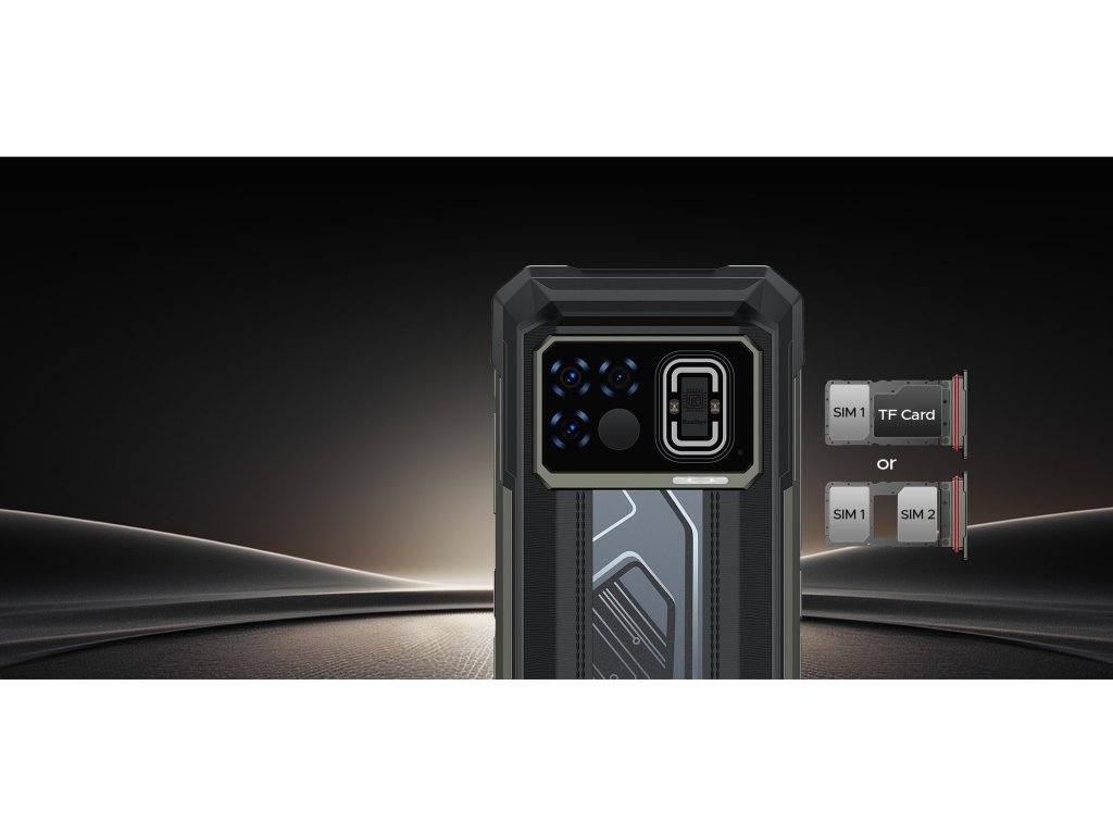 8GB + 12GB RAM | 256GB ROM | Dimensity 7050 | 6.72 palce | 20800 mAh baterie | IP68 | čtečka otisku prstů | NFC | české LTE | 50MPx + 16MPx | termokamera | termokamera | Android 14 | dual sim | 33W nabíjení | pokročilá LED notifikace | 118dB reproduktor