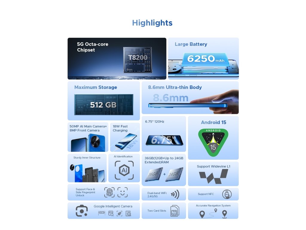 12GB + 24 GB RAM | 512GB ROM | Unisoc T8200 | 6.75 palce | 6250 mAh baterie | detekce obličeje | české LTE | VoLTE | 5G |50MPx + 8MPx | Android 15 | dual sim | reverse charging | extra tenký design